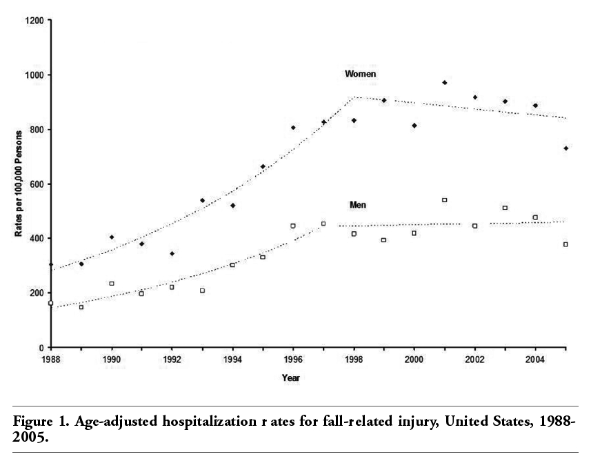 In conclusion, the present study indicates that hospitalization rates for fall-related injury clearly increased among older adults in the United States from 1988 to 2005. Furthermore, the aging of the population is likely to increase the number of hospitalizations for severe fall-related injury.