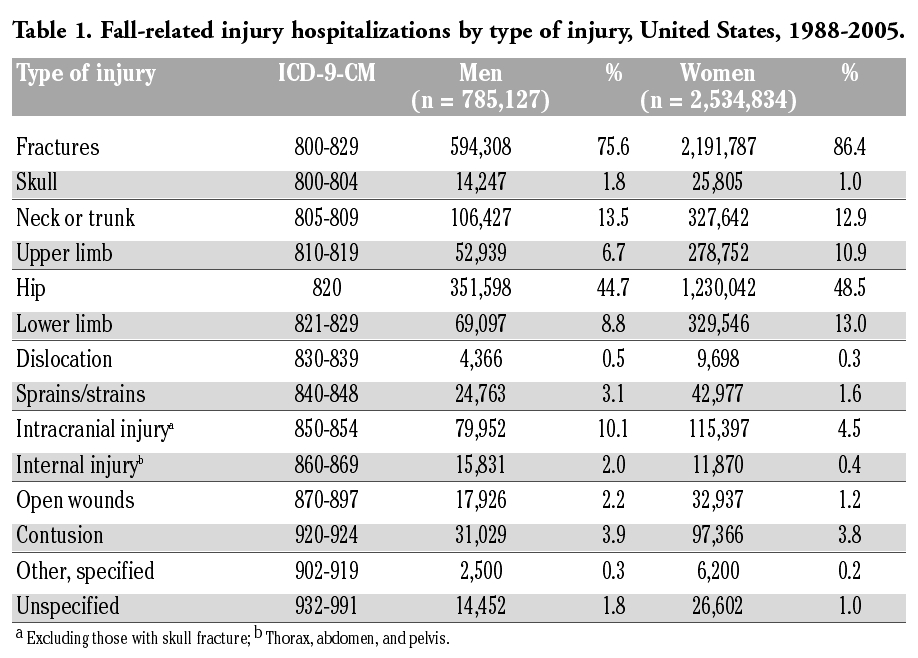 | Table 1. Fall-related injury hospitalizations by type of injury, United States, 1988-2005. |