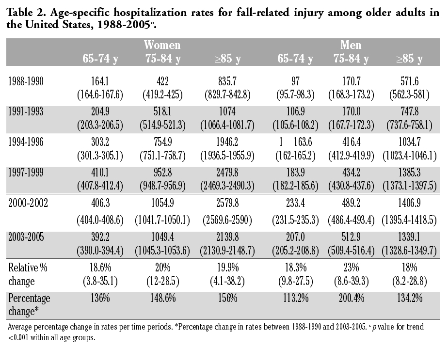 | Table 2. Age-specific hospitalization rates for fall-related injury among older adults in the United States, 1988-2005a. |