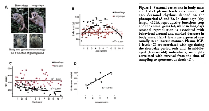 Thus, in the gray mouse lemur, age-associated changes in IGF-1 plasma levels are observed only during the short-day sexual rest period, when body fat is maximal. IGF-1 starts to decrease as soon as the second year of age. This is in striking contrast with two other hormones, dehydroepiandrosterone sulfate (DHEA) and testosterone, the levels of which decline only after six years of age and in the long-day-length season.4 Indeed, when considering slopes of age-related changes, the earliest and fastest change concerned IGF-1 decrease during the short-day-length season (body mass: 6.9%/year; DHEA: 11.6%/year; IGF-1: 17.4%/year).