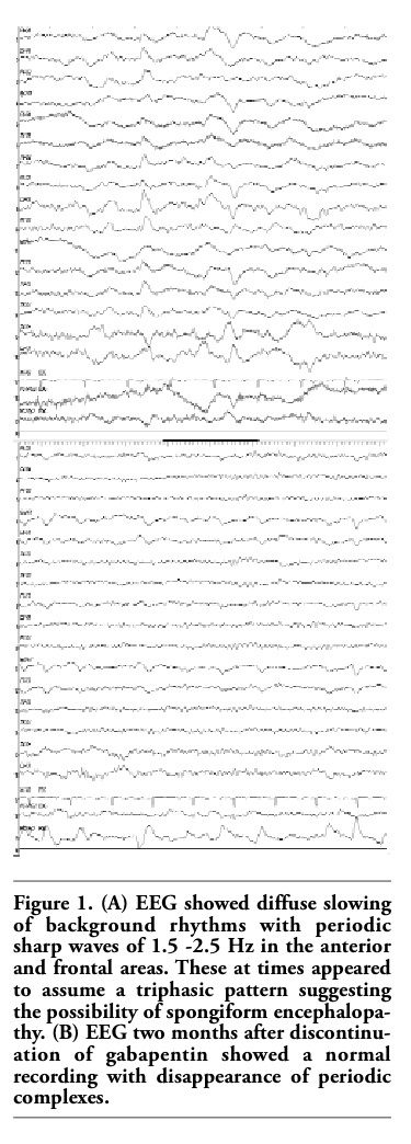 Creutzfeldt–Jakob disease (CJD) is a neurodegenerative disease caused by the accumulation of abnormal prion protein in the brain.1,2 While electroencephalography (EEG) of patients with CJD often demonstrates periodic biphasic or triphasic waves, numerous instances of CJD-like syndromes with similar EEG changes have been associated with drug toxicity.3,4,5,6,7,8,9,10,11,12,13,14 We report a case of a CJD-like syndrome associated with gabapentin.