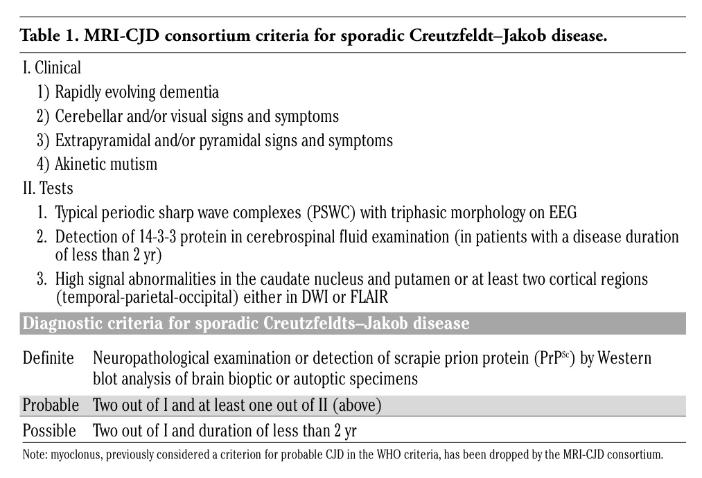 | Table 1. MRI-CJD consortium criteria for sporadic Creutzfeldt–Jakob disease. |