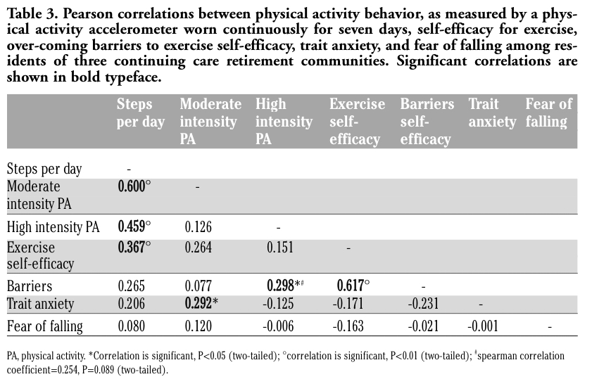 | Table 3. Pearson correlations between physical activity behavior, as measured by a physical activity accelerometer worn continuously for seven days, self-efficacy for exercise, over-coming barriers to exercise self-efficacy, trait anxiety, and fear of falling among residents of three continuing care retirement communities. Significant correlations are shown in bold typeface. |