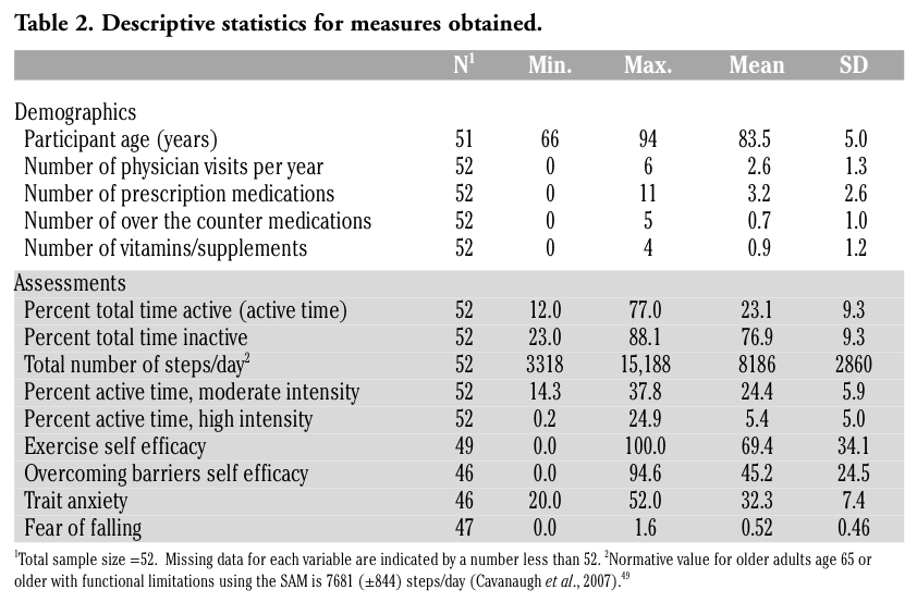 Participant demographic data are presented in Table 1. The sample had a mean age of 84 years, was fairly well-educated, and most were previously or currently married. Participants took an average of three prescription medications, one over the counter medication, and one dietary supplement, consistent with reports of medication usage in older adults in the U.S.42 Table 2 shows the descriptive data for the measures obtained. One participant used an assistive walking device (a “walker”), however this participant was not an outlier and his accelerometer data were nearly identical with the sample means.