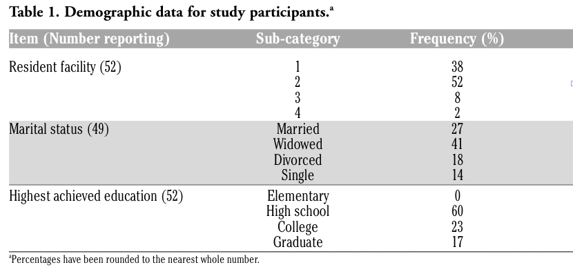 Participants were recruited through informational sessions (total attendance of 81 residents), fliers distributed to the residents’ mailboxes and in public places including common dining areas (approximate distribution of 400 fliers), and through word of mouth. Those who were interested were invited to return on a specific date to participate in the study. Each of the CCRCs offered comprehensive rehabilitation services. Participants who required support in order to complete the study surveys could seek assistance from one of the researchers or from individuals employed in the CCRC recreation department.