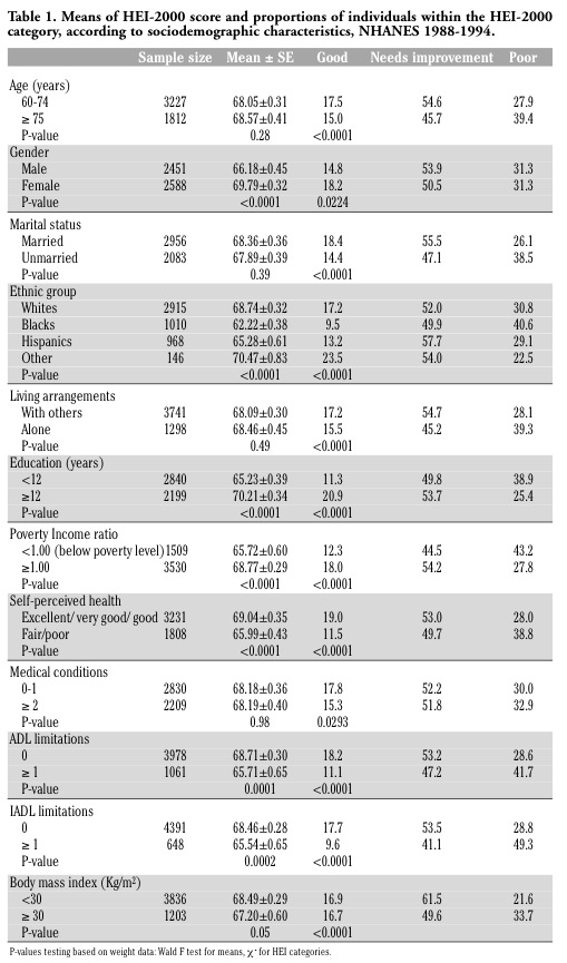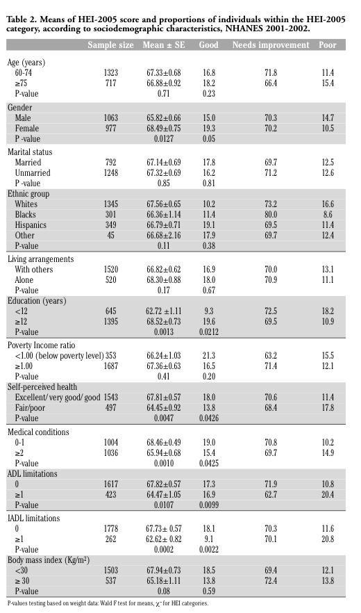 Table 2 shows the means of HEI-2005 score and proportions of individuals within the HEI-2005 categories, according to sociodemographic characteristics, NHANES 2001-2002. A good HEI-2005 score was associated with high education, very good/excellent perceived health, low number of medical conditions, and low number of functional limitations (ADL or IADL).