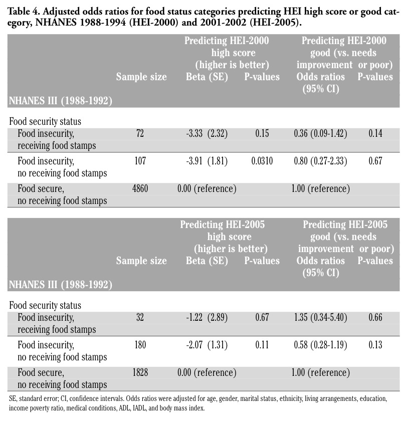 | Table 4. Adjusted odds ratios for food status categories predicting HEI high score or good category, NHANES 1988-1994 (HEI-2000) and 2001-2002 (HEI-2005). |
