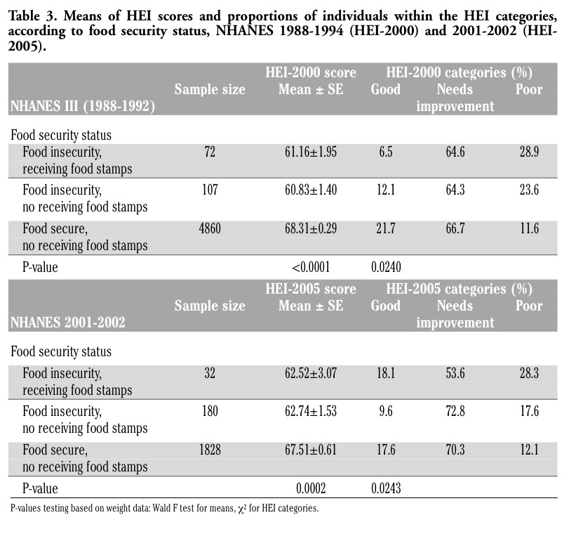 | Table 3. Means of HEI scores and proportions of individuals within the HEI categories, according to food security status, NHANES 1988-1994 (HEI-2000) and 2001-2002 (HEI-2005). |