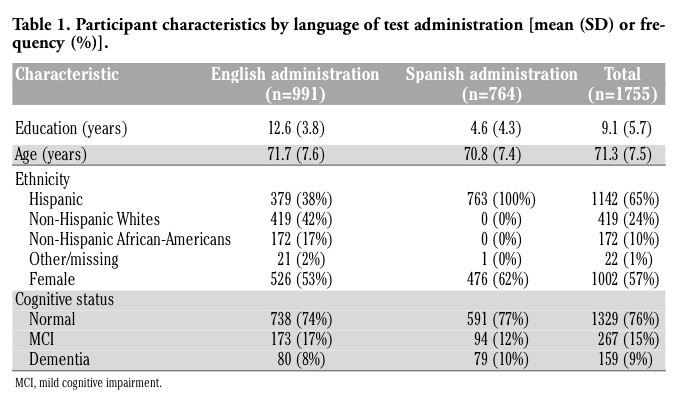 | Table 1. Participant characteristics by language of test administration [mean (SD) or frequency (%)]. |