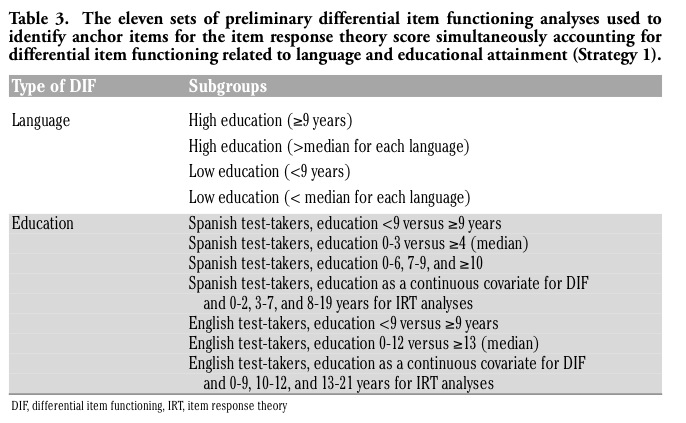 | Table 3. The eleven sets of preliminary differential item functioning analyses used to identify anchor items for the item response theory score simultaneously accounting for differential item functioning related to language and educational attainment (Strategy 1). |