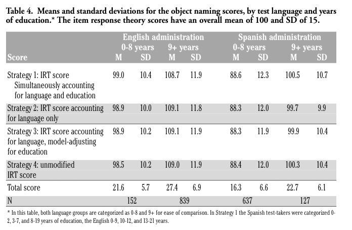 | Table 4. Means and standard deviations for the object naming scores, by test language and years of education.* The item response theory scores have an overall mean of 100 and SD of 15. |