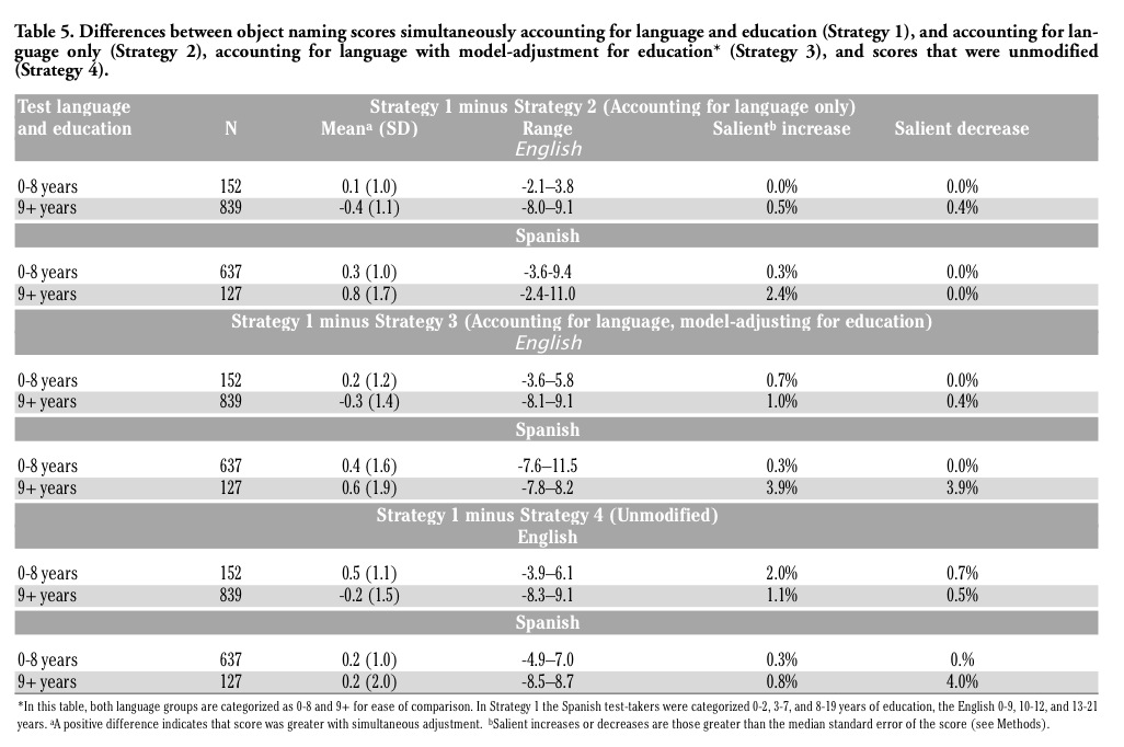 | Table 5. Differences between object naming scores simultaneously accounting for language and education (Strategy 1), and accounting for language only (Strategy 2), accounting for language with model-adjustment for education* (Strategy 3), and scores that were unmodified (Strategy 4). |