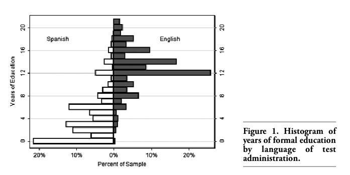 | Figure 1. Histogram of years of formal education by language of test administration. |