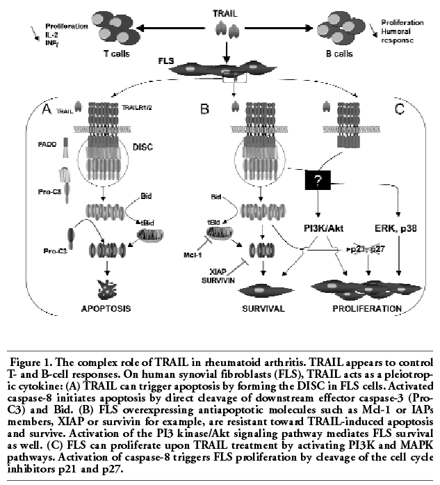 | Figure 1. The complex role of TRAIL in rheumatoid arthritis. TRAIL appears to control T- and B-cell responses. On human synovial fibroblasts (FLS), TRAIL acts as a pleiotropic cytokine: (A) TRAIL can trigger apoptosis by forming the DISC in FLS cells. Activated caspase-8 initiates apoptosis by direct cleavage of downstream effector caspase-3 (Pro-C3) and Bid. (B) FLS overexpressing antiapoptotic molecules such as Mcl-1 or IAPs members, XIAP or survivin for example, are resistant toward TRAIL-induced apoptosis and survive. Activation of the PI3 kinase/Akt signaling pathway mediates FLS survival as well. (C) FLS can proliferate upon TRAIL treatment by activating PI3K and MAPK pathways. Activation of caspase-8 triggers FLS proliferation by cleavage of the cell cycle inhibitors p21 and p27. |