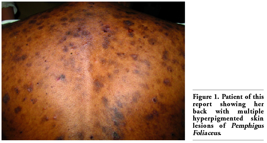 | Figure 1. Patient of this report showing her back with multiple hyperpigmented skin lesions of Pemphigus Foliaceus. |