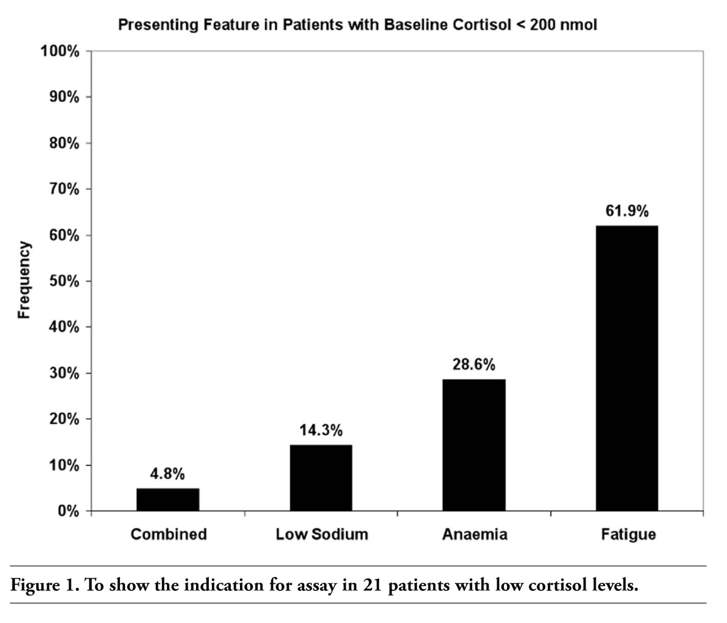 Our data shows that cortisol is more likely to be low in patients with fatigue if they have rheumatic disease. Such links have been hypothesised but infrequently reported, although a relationship between other rheumatic disorders and primary adrenal failure has been described.44,45 Adrenal failure secondary to pituitary disease is relatively rare and unsurprisingly, we found no cases of this in our study. However we did detect three patients who had been on oral steroids long term and who developed tertiary adrenal insufficiency, resulting from inadequate CRH release from the pituitary with a resultant decrease in ACTH release.