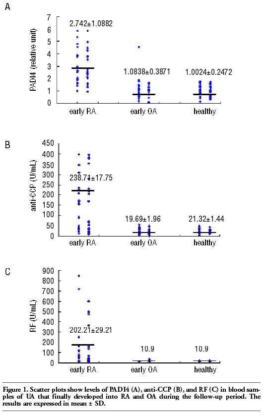 | Figure 1. Scatter plots show levels of PADI4 (A), anti-CCP (B), and RF (C) in blood samples of UA that finally developed into RA and OA during the follow-up period. The results are expressed in mean ± SD. |