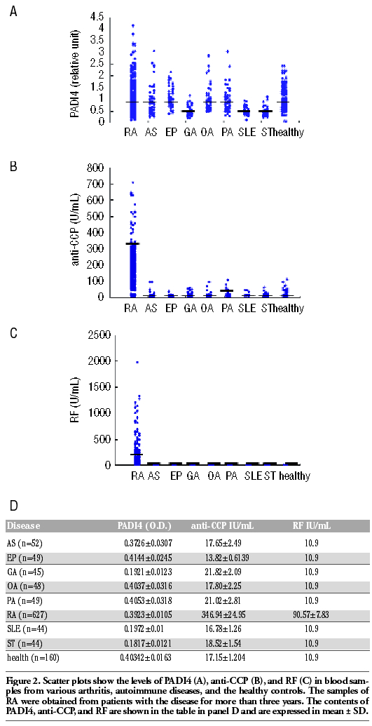 A functional haplotype of peptidylarginine deiminase 4 (PADI4) gene is susceptible to rheumatoid arthritis (RA) in Japanese, Korean, and German populations.1,2,3 Patients with RA, an autoimmune disease, have diverse autoantibodies in their blood, including anti-filaggrin antibody (AFA), anti-keratin antibody (AKA), anti-perinuclear factor (APF), and other autoantibodies. The B-cell epitope for these autoantibodies contains citrulline, an amino acid metabolite of arginine. PADI4 converts peptidylarginine to citrulline in a process known as citrullination. Hence, PADI4 and its citrullination activity are considered to play an essential role in pathogenesis of RA.4,5 Although PADI4 has been detected in synovial tissues of RA,6 only a few studies have investigated the level of the enzyme in the blood of patients, and there is no report about the expressional profile during the pathogenic process of the disease.