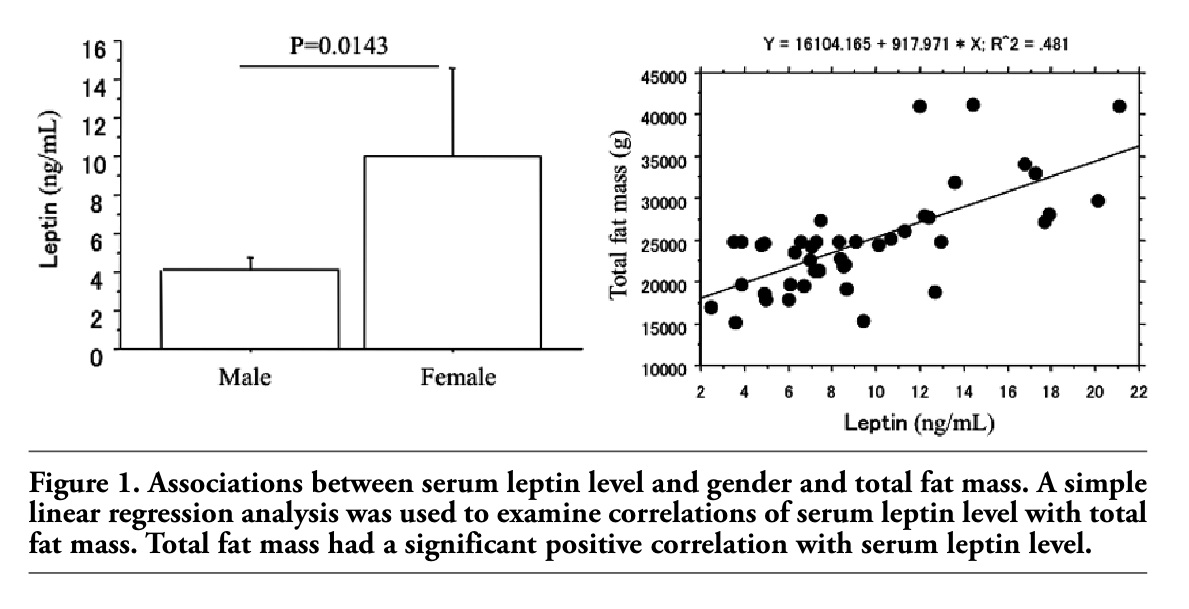 Figure 1 also shows the correlation between the serum leptin level and the total fat mass according to a simple regression analysis.