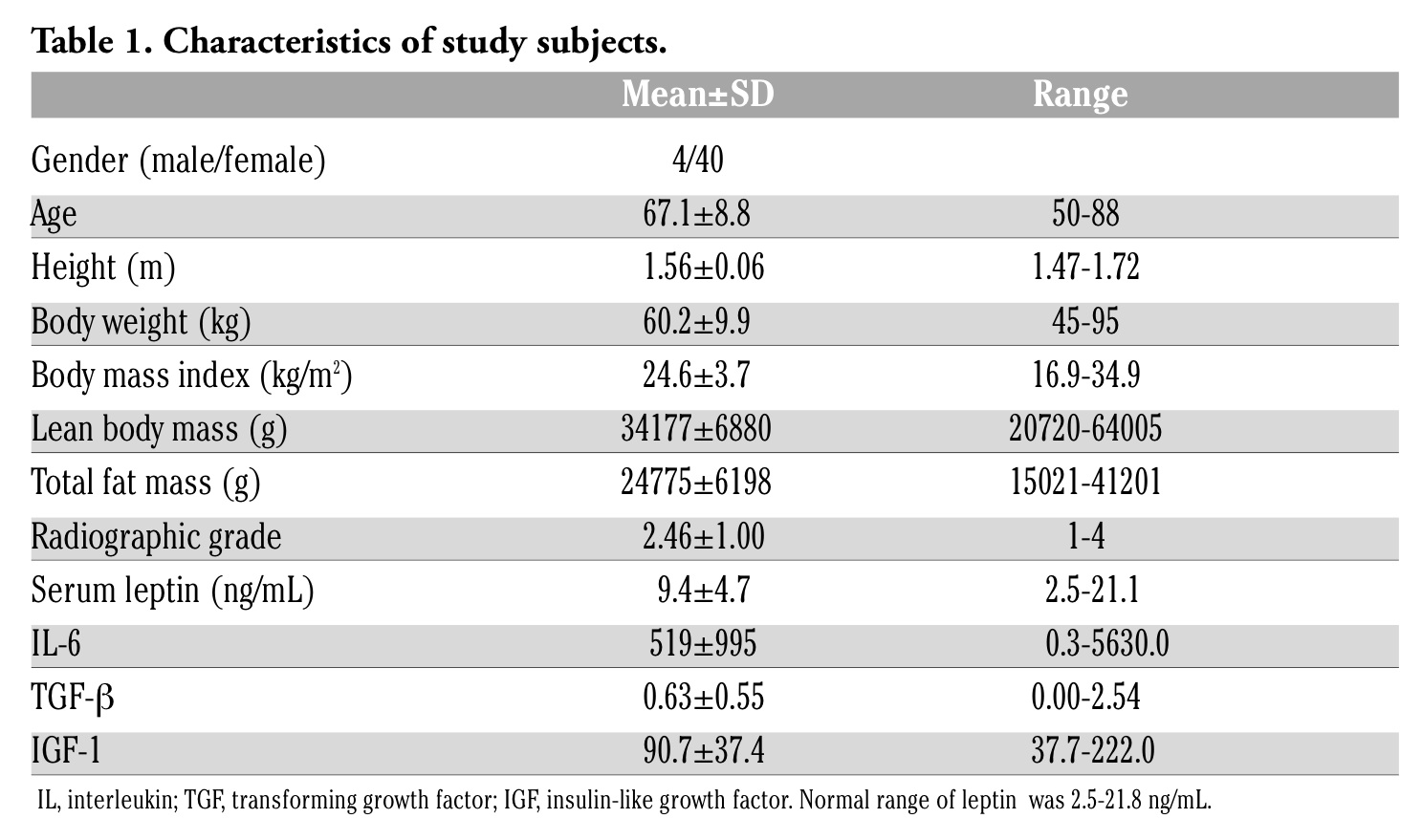 Aging, obesity, and female gender are risk factors for OA of the knee.8 Knee OA is the most common type of arthritis and the major cause of chronic musculoskeletal pain and mobility disability in elderly populations, representing a significant burden on healthcare provision. Clinically, however, the correlation between the serum leptin concentration and the severity of OA or the IL and growth factor levels has not been fully elucidated. Clarifying the associations between the serum leptin concentration and gender, fat mass, and the IL and growth factor levels in the synovial fluid of patients with knee OA would be of great interest. The objective of the present clinical study was to determine the associations between the serum leptin concentration and various factors including age, height, body weight, body mass index (BMI), lean body mass, total fat mass, radiographic grade of OA, and the IL and growth factor levels in synovial fluid among patients with knee OA.