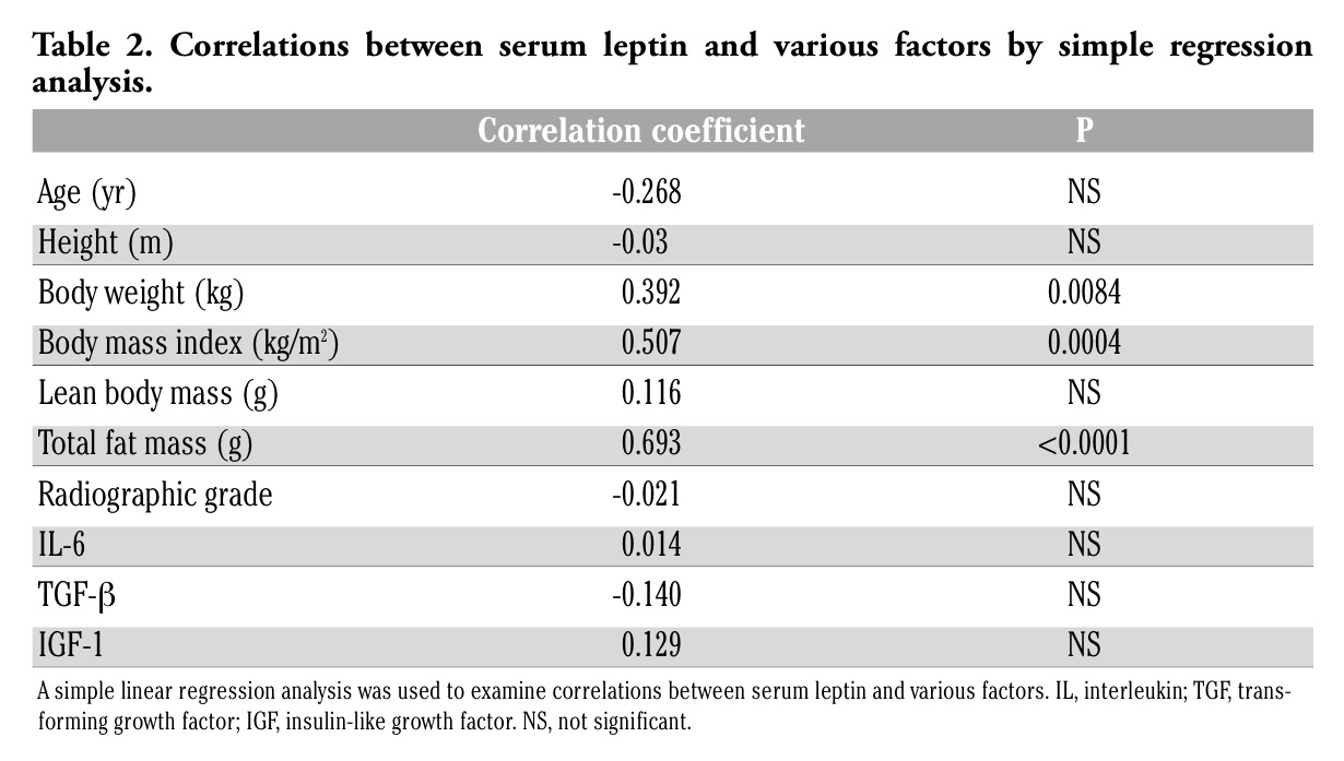 | Table 2. Correlations between serum leptin and various factors by simple regression analysis. |