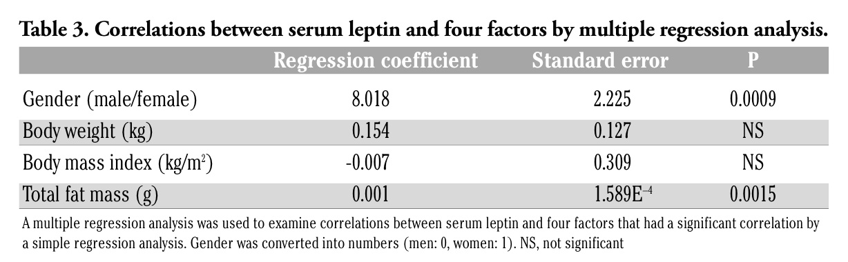 | Table 3. Correlations between serum leptin and four factors by multiple regression analysis. |