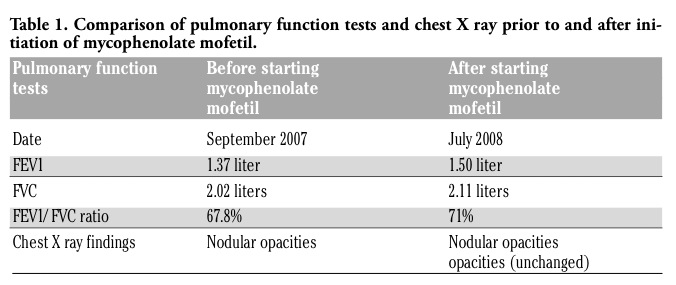 | Table 1. Comparison of pulmonary function tests and chest X ray prior to and after initiation of mycophenolate mofetil. | |