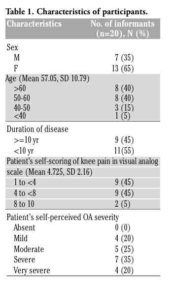 Qualitative research is a powerful way of uncovering complex experiences among patients with OA of the knee.18,19 The qualitative methodology used in our research has generated data to fill some gaps in the knowledge of management of the disease by providing information on how patients describe their symptoms, how the symptoms affect their quality of life, how they perceive the impact, what they expect about treatment, and their health-seeking behavior. This knowledge may help doctors to become aware of and to understand the problem, needs, and expectations of patients with OA of the knee. Three interesting areas are identified in this research.