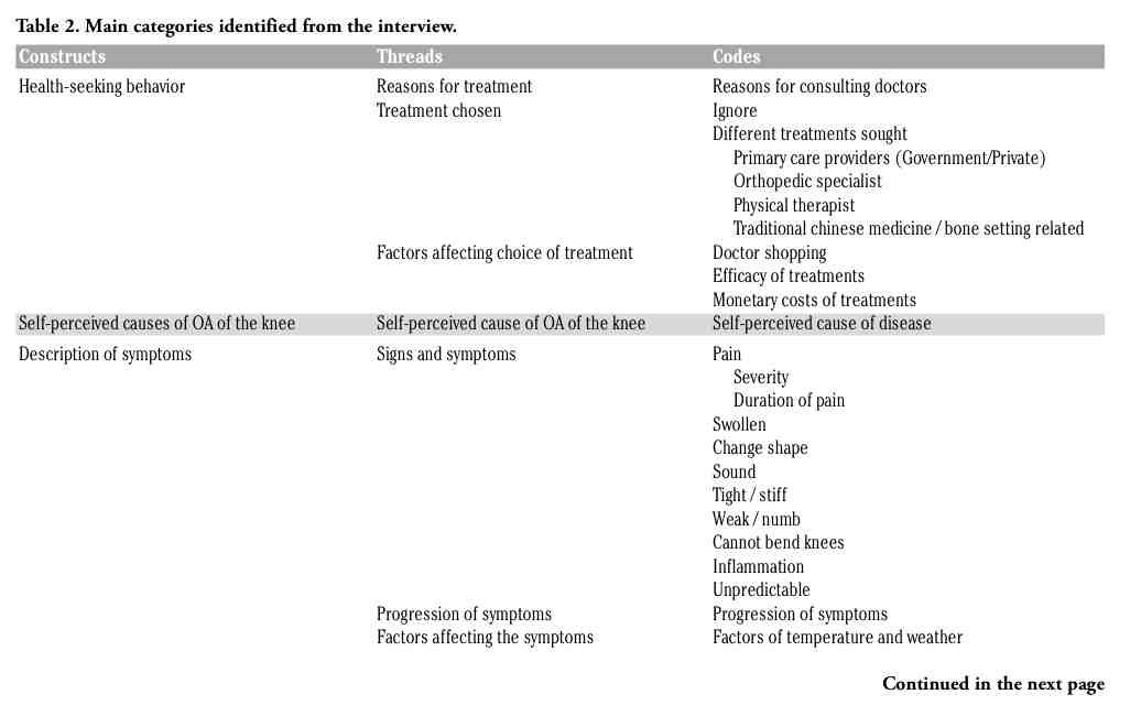 All the interviews were conducted in Chinese. The sampling was continued until the research assistant found the content of further interviews was repeating itself. The interviews were audio-taped and transcribed in Chinese. The content was analyzed independently by two researchers, one male and one female, who were not doing the interviews. Ideas and themes generated from the interviews were analyzed based on Glaser and Strauss’s grounded theory.14,15,16 From the data collected, codes were extracted from the transcripts by the individual researcher on the basis of what the interviewees discussed, as well as the issues that the researcher believed to be salient based on his/her prior knowledge and theoretical understanding of the pathophysiology of OA of the knee. The results of the analyses were compared and discussed between the two researchers using the constant comparative approach17 until a final version of the codes was agreed. The codes were then grouped into threads based on the descriptive text derived directly from responses to the interview questions, while those more interpretive ones were based on data from a number of questions. In order to make the threads more manageable, related threads were grouped into a construct.