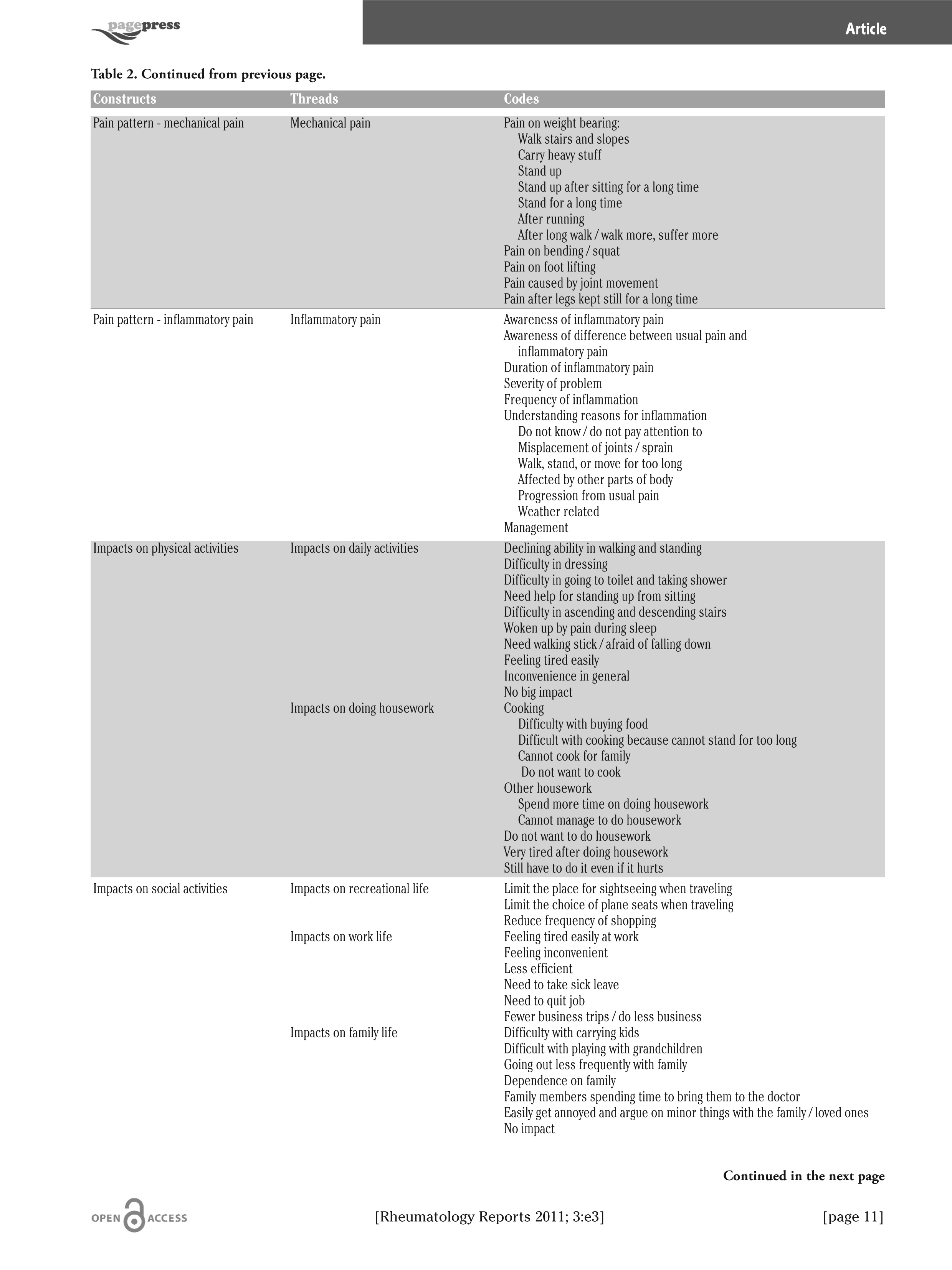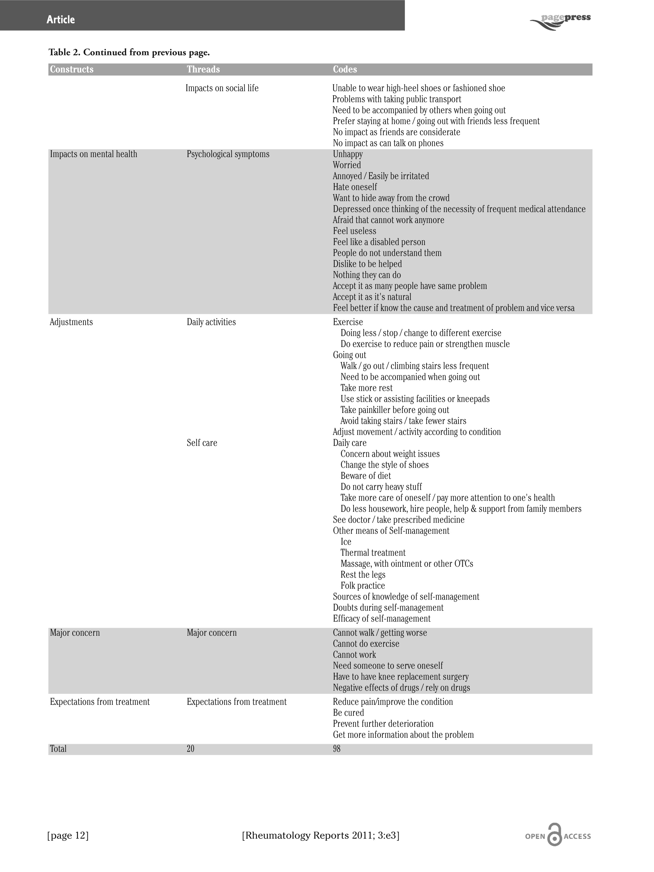 A total of three interview sessions was carried out over three days between September and October 2009. One session was held on a weekday morning, one session on a weekday afternoon extending into the evening, and one session on a Saturday morning. This arrangement was aimed at including more people of broad socio-economic status. A total of 20 interviews was conducted and each interview lasted for about an hour. The characteristics of the interviewees are shown in Table 1. There was a predominance of females (66%) with most (80%) interviewees being over the age of 50 years. Nearly half (46%) reported having OA of the knee for more than 10 years. Nine patients (45%) self-evaluated their pain score to be <4 and another nine patients (45%) reported a pain score of between 4 and <8. The mean pain score of all 20 patients was 4.725 (standard deviation, 2.16). OA was considered severe in seven patients (35%), moderate in five patients (25%), mild in four patients (20%), and very severe in the remaining four patients (25%). A total of 98 codes was identified from the transcripts, which were classified into 20 threads and then grouped into 11 constructs. (Table 2a b c).
